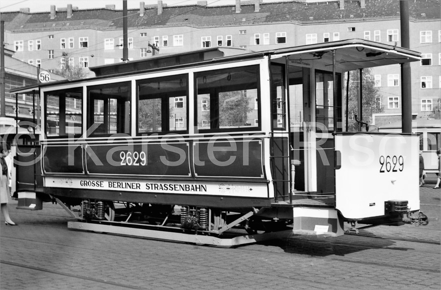 Beiwagen 2629 für den elektrischen Betrieb der Groß Berliner Straßenbahn ist ein umgebauter "Sommer-Winter"-Wagen von Orenstein & Koppel und wurde 1908 gebaut. Fahrzeugausstellung auf dem Betriebshof Königin-Elisabeth-Str. in Charlottenburg (Char)